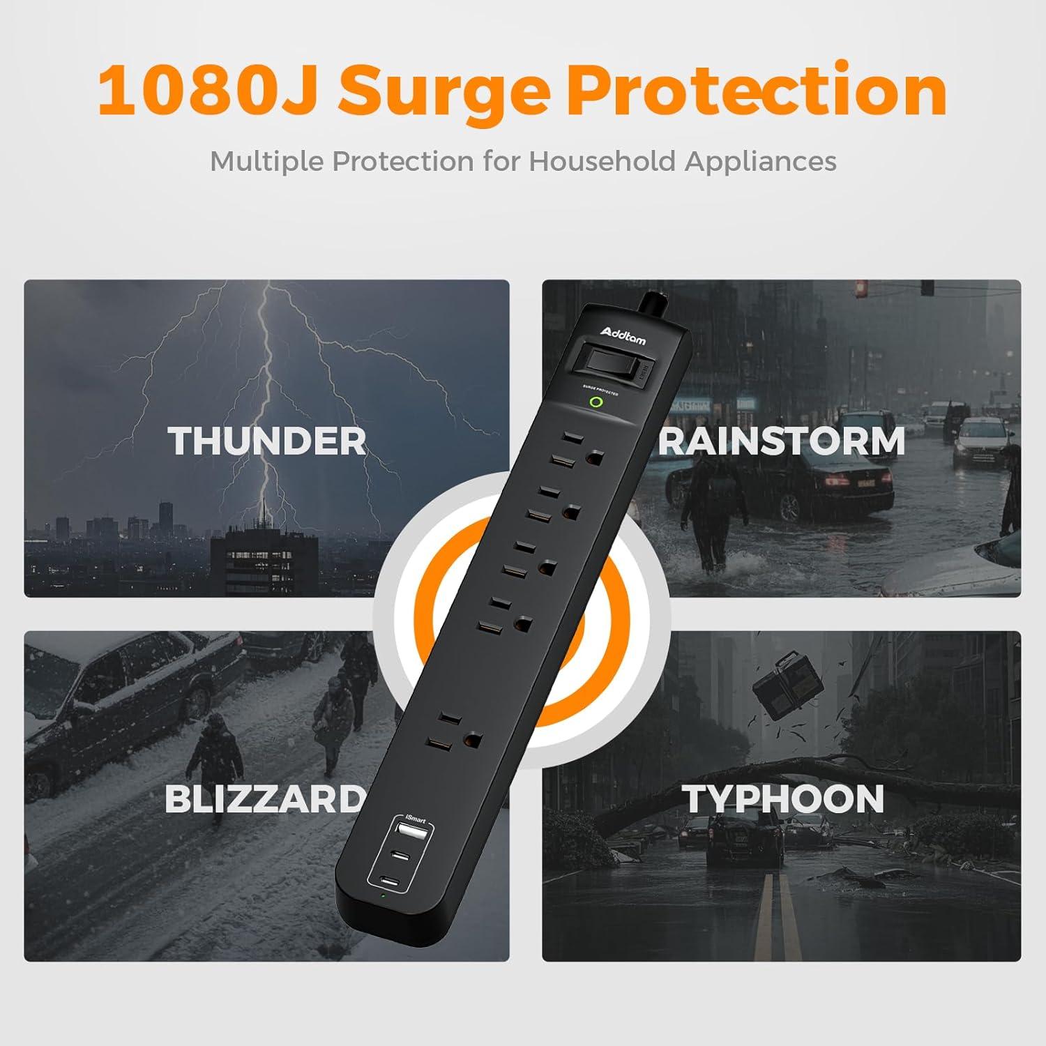 【 5 Surge Protector Outlet 】- With 3 complementary Surge Protection Circuits, TVS(transient voltage suppressor) MOV(metal oxide varistor) GDT(gas discharge tube), can absorb capacity of 1080 Joules. It's more quickly and reliably than the traditional surge protector circuit, can protect your tv, computer from voltage fluctuations, surges and spikes(“SURGE PROTECTED” indicator light on to show your devices are protected)