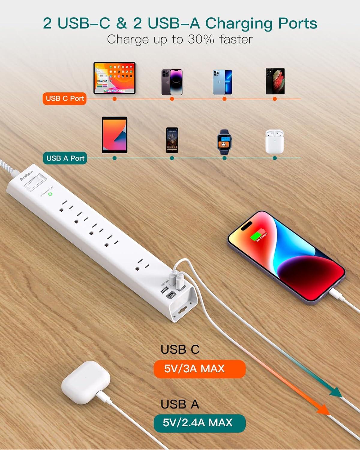 【Power Strip with USB】 – This surge protector with 3 USB charging ports provide 3.1A/15.5W in total. Built-in smart charging technology that detects and deliver an ideal input current of up to 5V/2.4A (the actual current is decided by the demand for the devices)