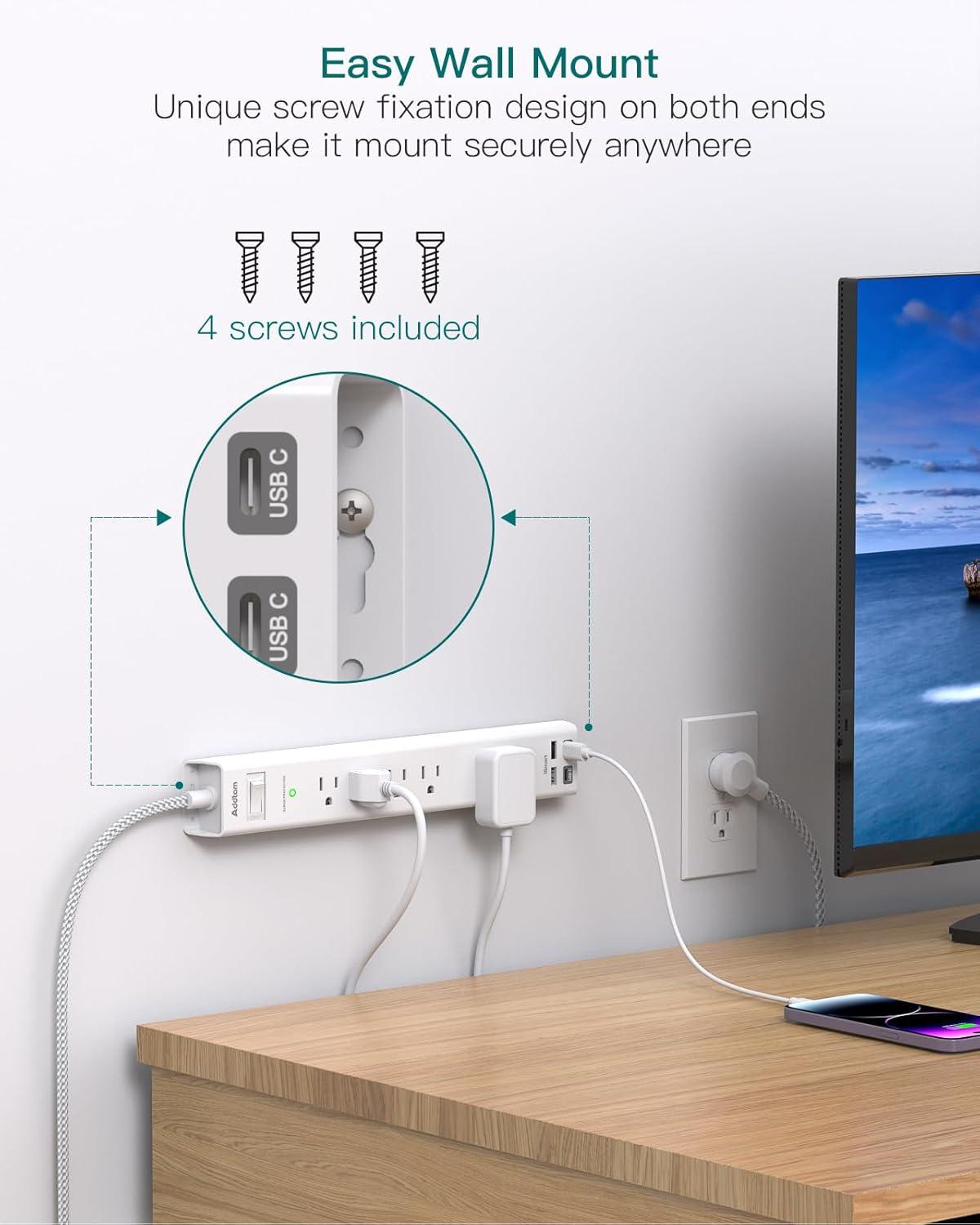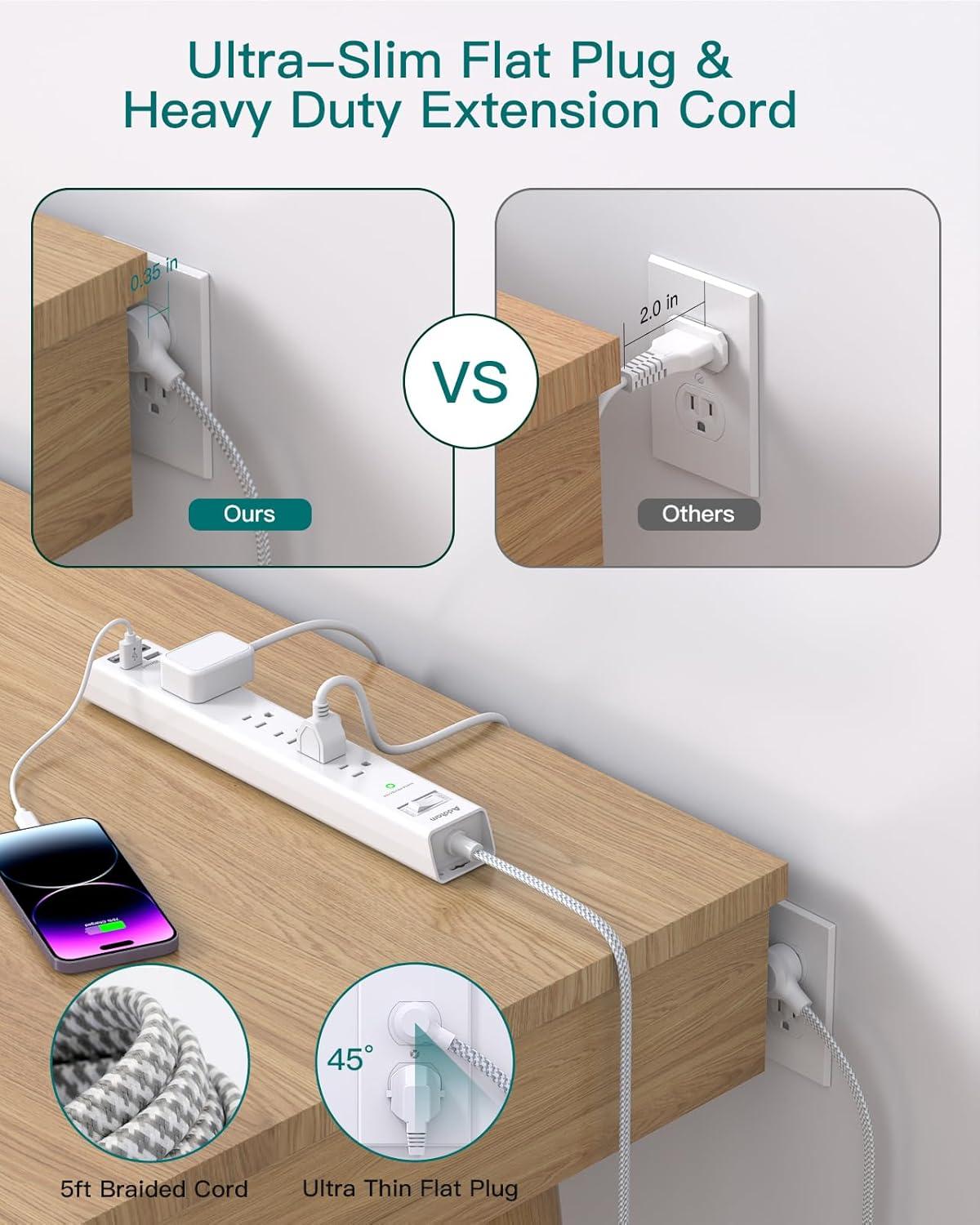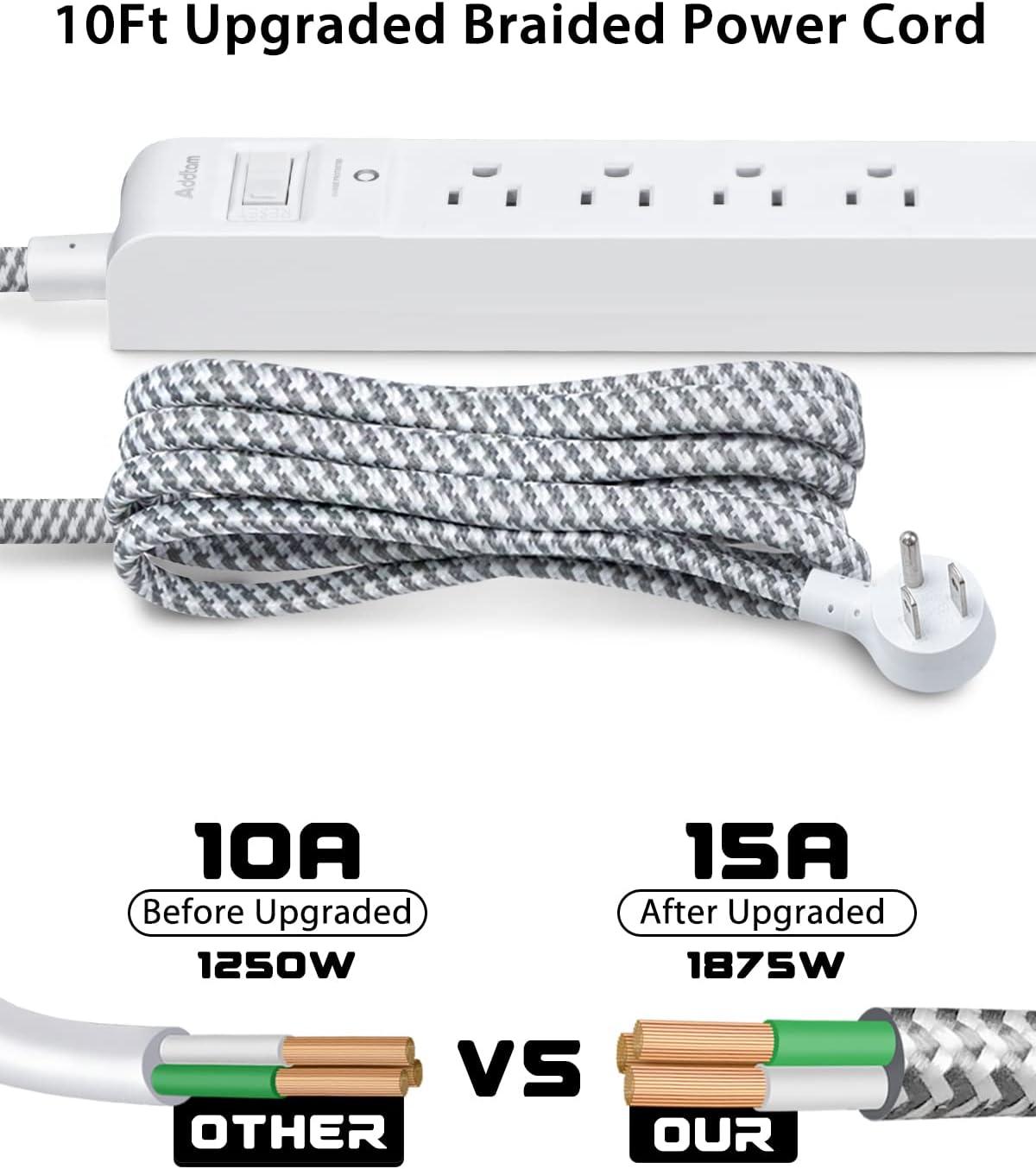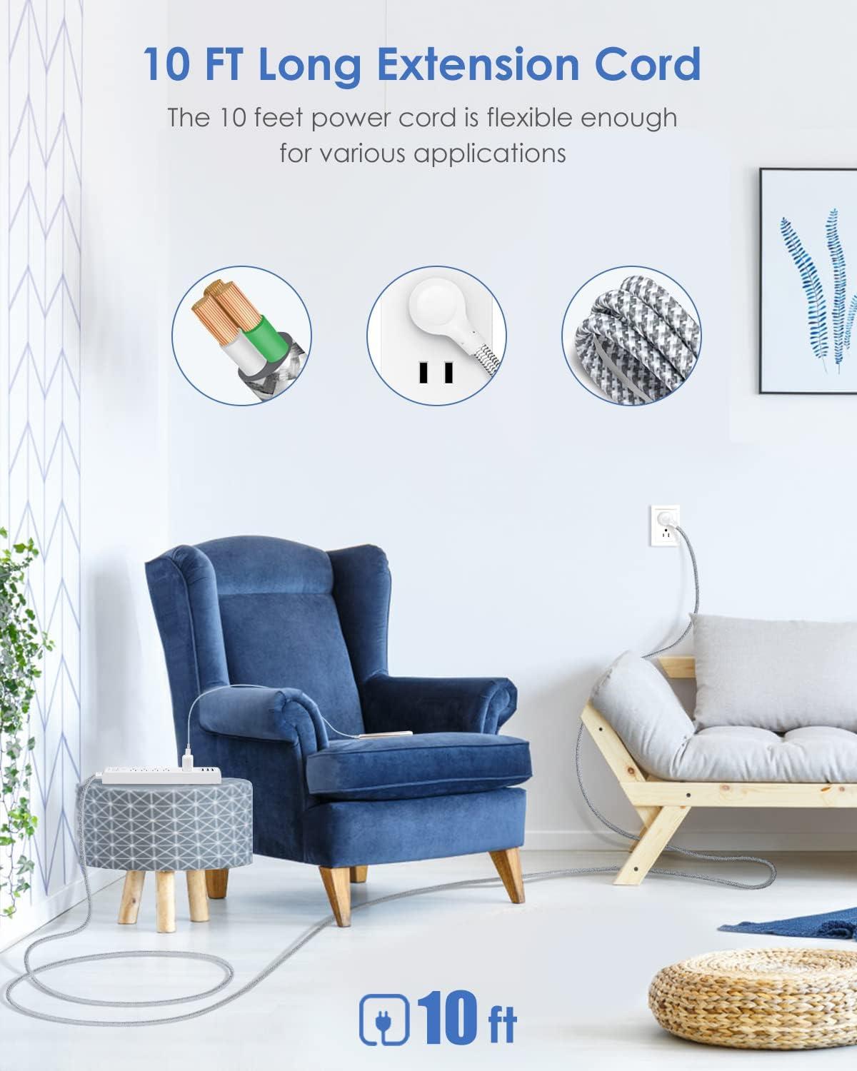 【5Ft Upgrded Extension Cord & Wall Mountable】 – The 5ft-long extension cord is made of 14AWG pure copper, which is very thick and has better current carrying capacity (15A). The braided power cord is not easy to deform, durbale and more safety than other power cord. The 45°flat plug will not block the bottom receptacle of your duplex wall outlet. Two holes on back allow you install the power strip on wall, workshop, make your table clean