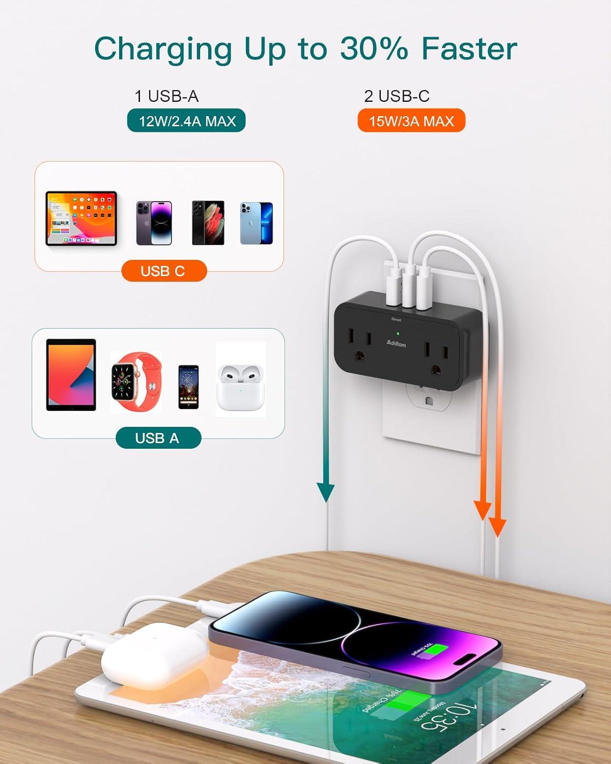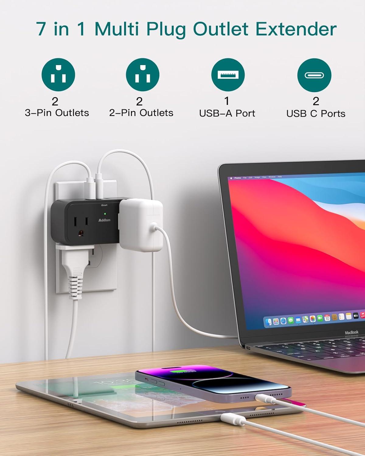 【7-in-1 Multi Plug Outlet Splitter】- This wall plug extender could turn 1 socket into 4 AC outlets and 3 USB ports; Widely space design can fit 4 big plugs at the same time without blocking, make your bedside table and desktop organized, support 125V, 15A, max 1875W.