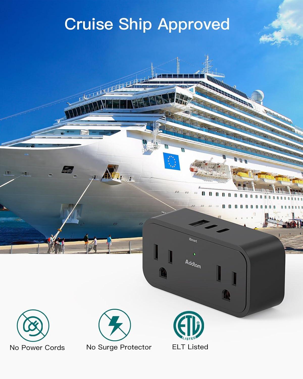 【Cruise Ship Essentials】- The wall plug outlet with NO surge protection NO extension cords, which is cruise ship approved. It's absolutely a must have cruise accessories as Cruise lines will not accept power strips with surge protection and many prohibit extension cords ( such as Carnival, Royal, Princess and etc.). Multiple plug outlet is also perfect for bedroom, bathroom, kitchen, hotel and college dorm room usage.