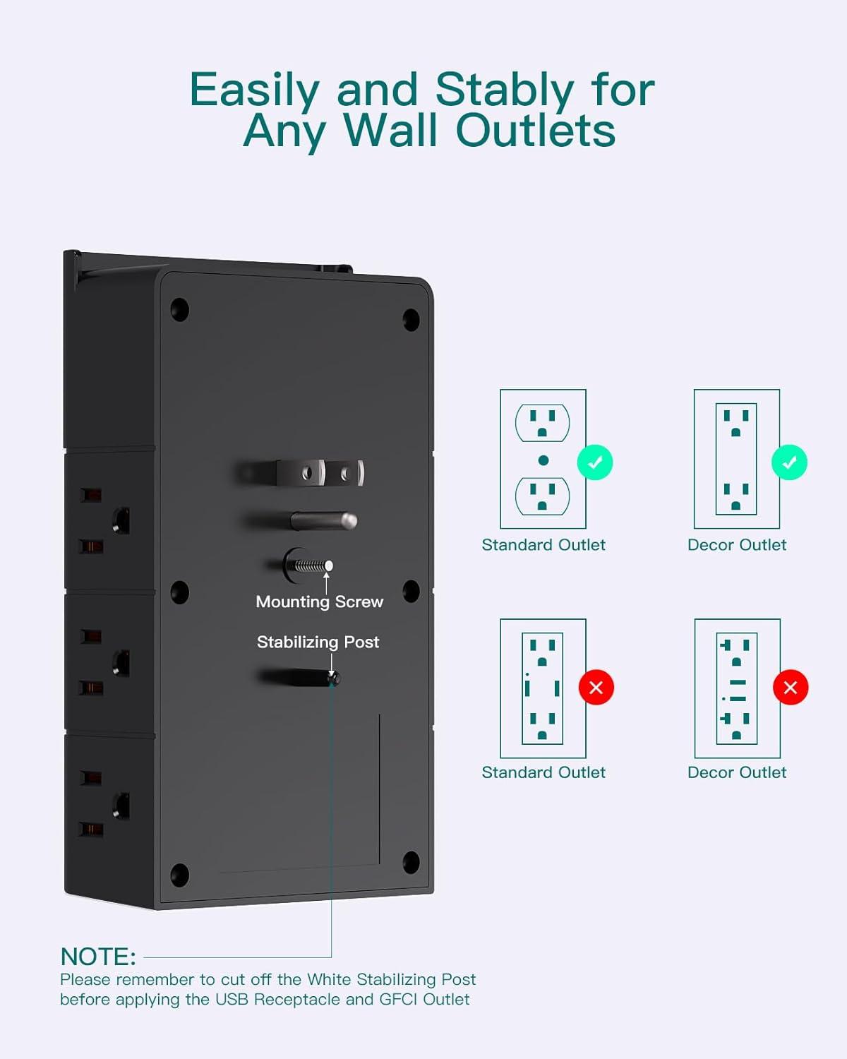 【Multiple Outlet Wall Plug】 12 AC outlets (125V, 15A,1875W) with surge protector wall mount, 3 USB ports, surge protection indicator light. With mounting screw and stabilizing rod, the outlet wall adapter can fit for the standard outlet, decorator outlet; For GFCL and USB Receptacle outlet, the stabilizing rod can be cut off