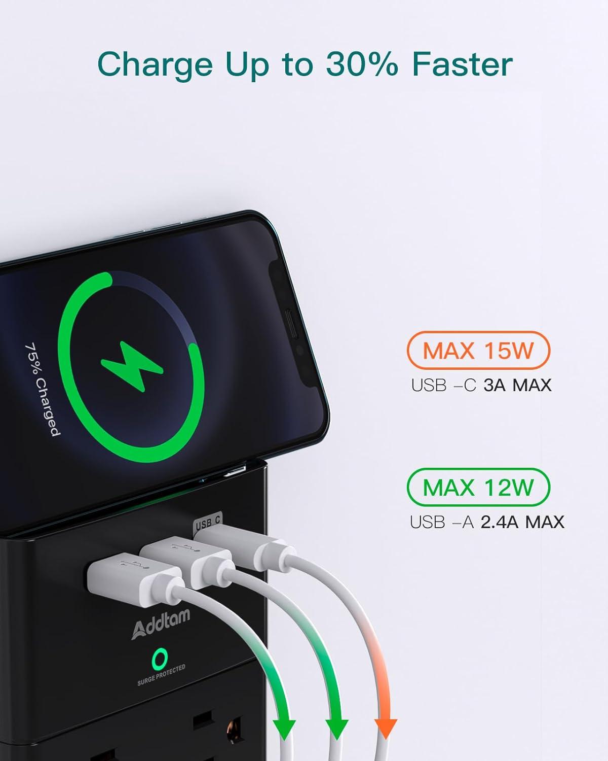【Smart USB Charging Ports】 3 high-speed USB charging ports (5V/3.1A total, 1 USB C) can automatically detect charging devices and deliver optimal charging speed. USB A up to 2.4A per port, USB C up to 3A. Fits for phones, tablet and most usb devices