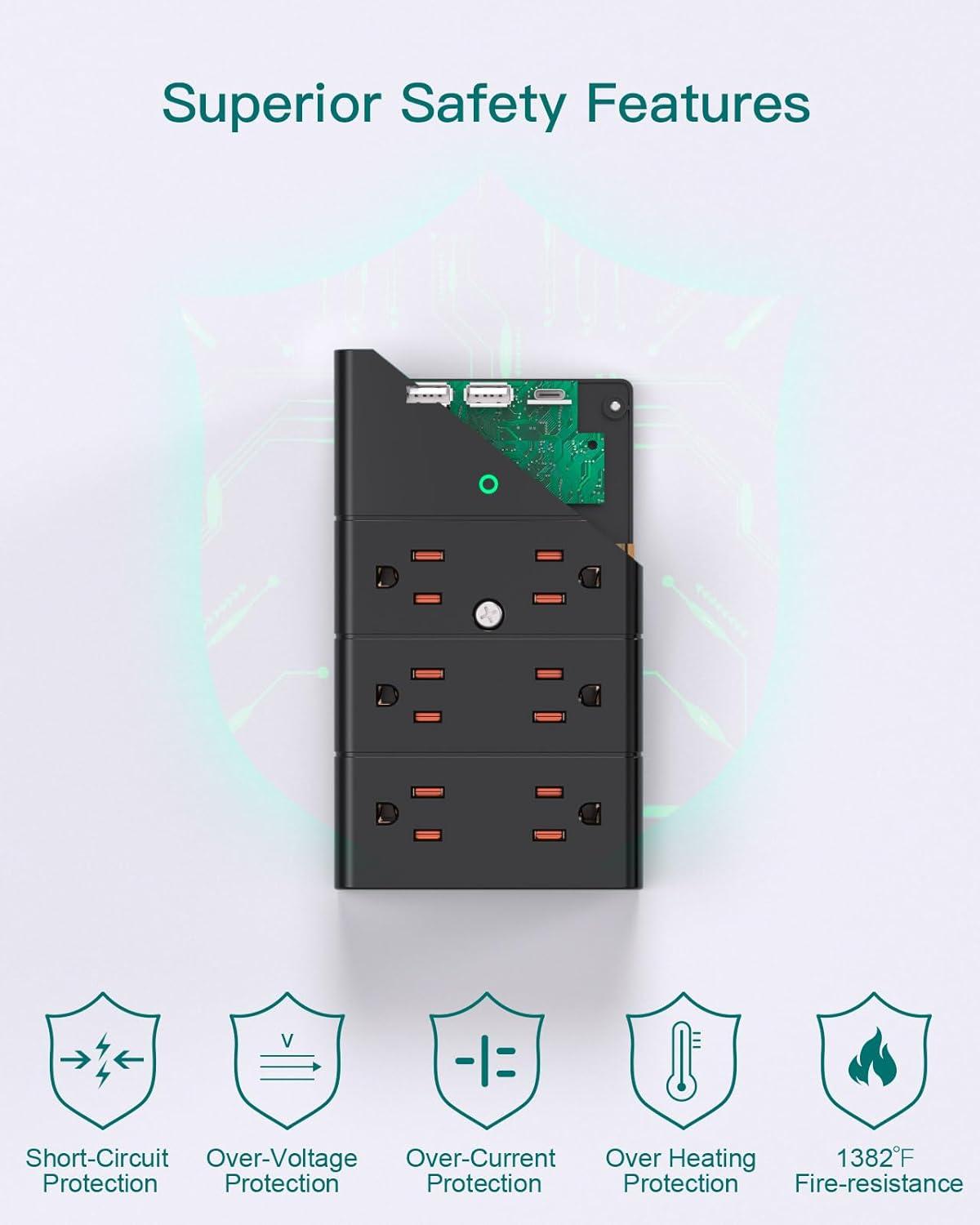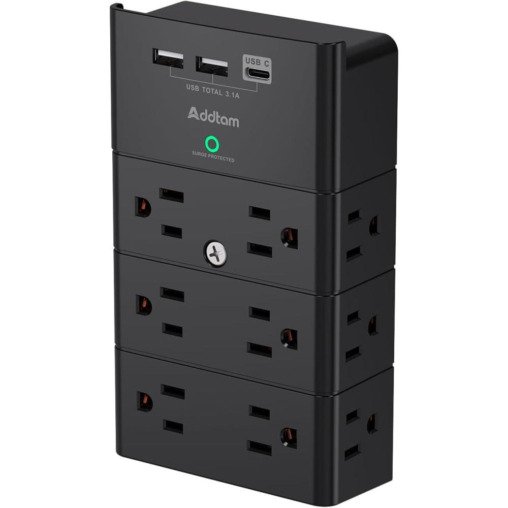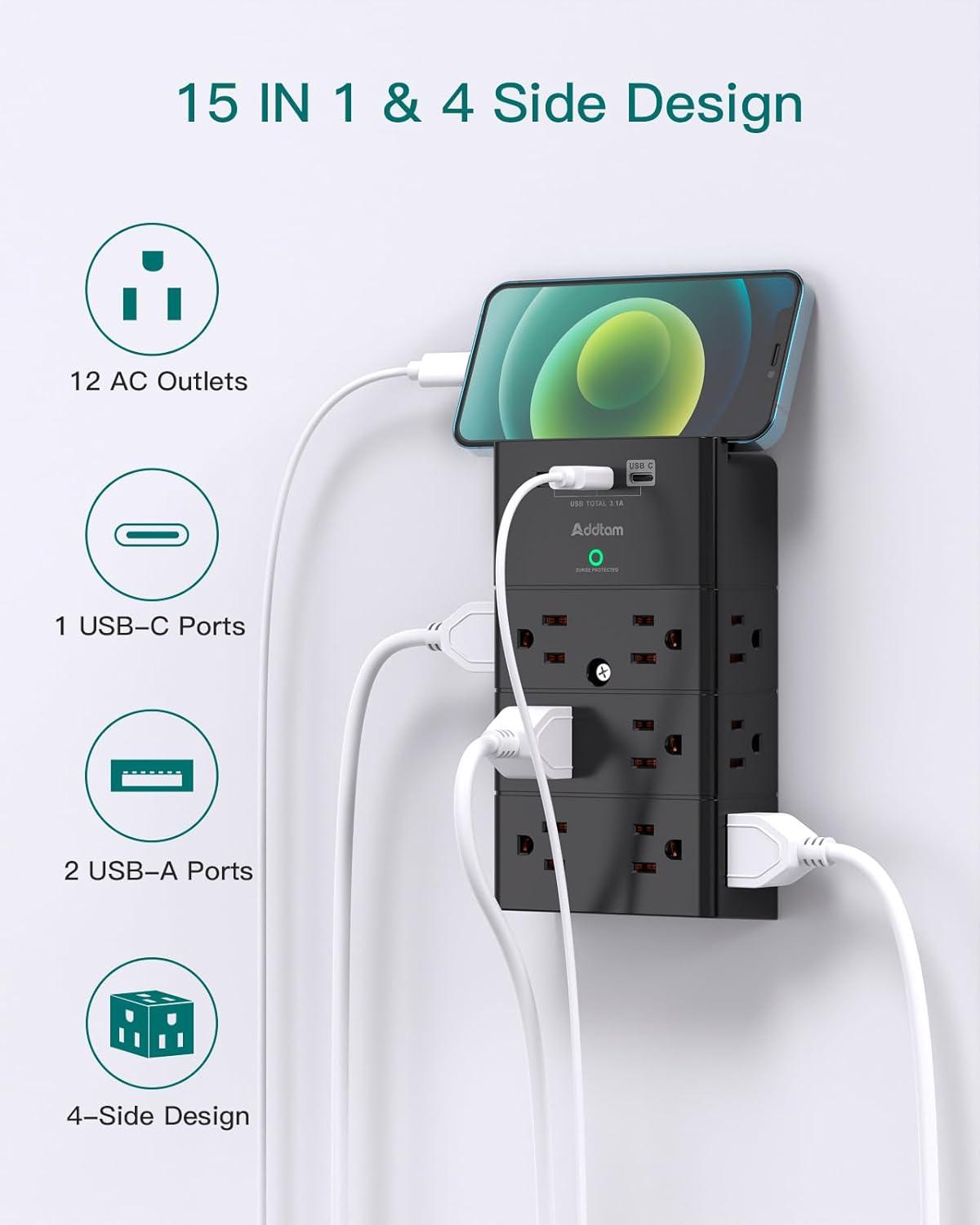 Multi Plug Outlet - Addtam Surge Protector Wall Mount with 12 Outlet Extender- 3 Sides and 3 USB Ports (1 USB-C), Outlet Splitter Power Strip for Home, Office, Hotel, Black(Black)
