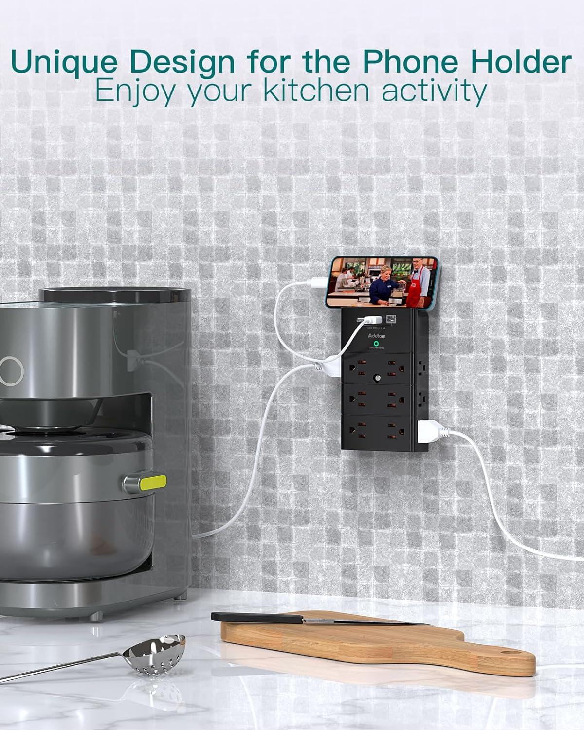 【4 Sides Power Outlet】 With 4-side design, you can have 12-outlet Splitter in limited space, enable to fit 12 standard plugs at the same time. The top phone holder design take more convenience for you, like watching movies while you cooking
