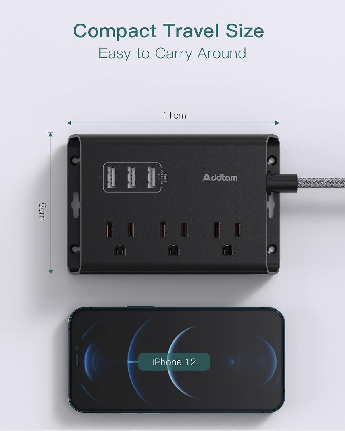 【Desktop Power Strip with USB】3 AC outlets and 3 smart USB ports desktop power strip flat plug can charge 6 electrical devices or electronics simultaneously, such as tablets, laptops, lamps, cameras, phones, etc. This small power strip supports a range of voltage 100-240V. ( Rated 13A/125V/1625W)
