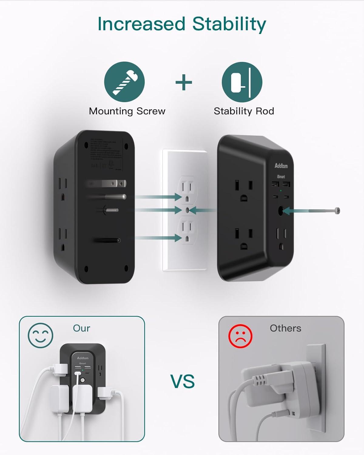 【Double Stability & Wide Space】- The screw included can be used to secure it on duplex outlet. The plastic prong at the back is for stable purposes also. For USB receptacle and GFCI outlet, the plastic prong needs to be cut off before use. 3-sided design and 1.7 inches large space between 5 sockets make it easier to use for all kinds of equipment