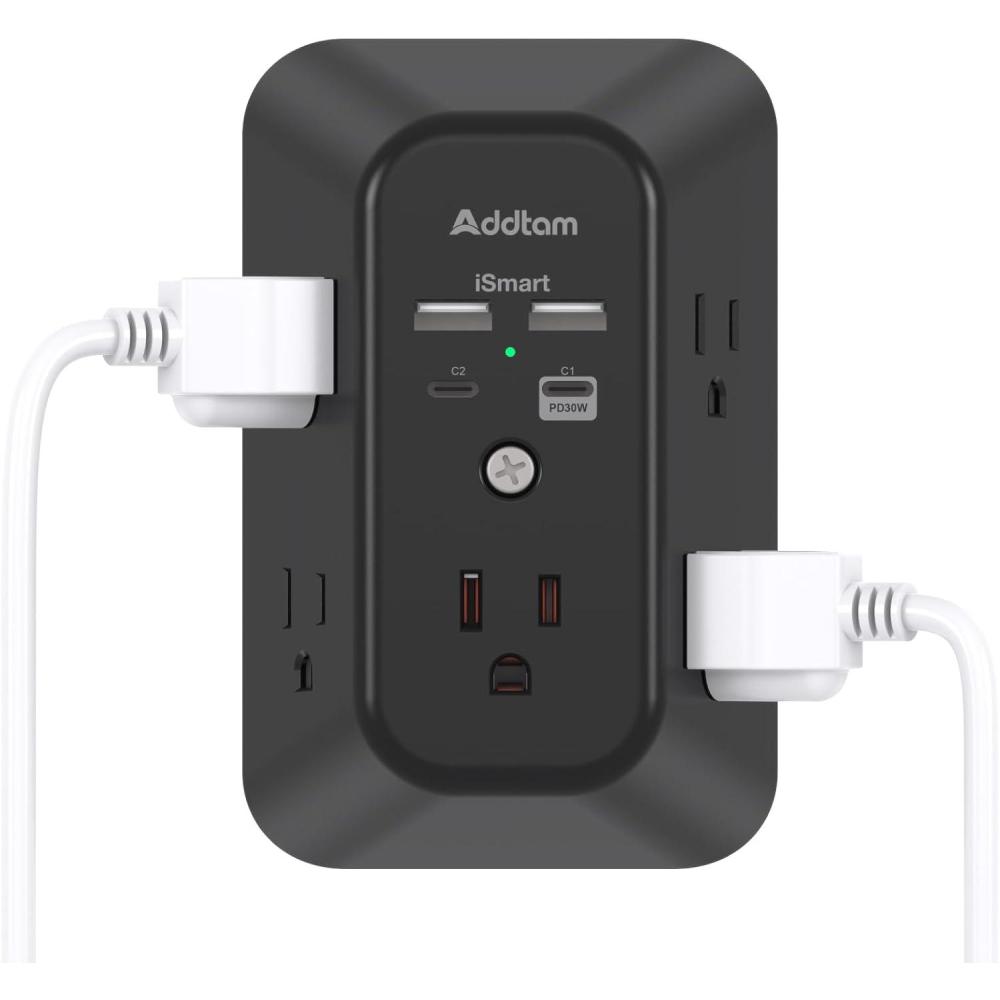 Surge Protector Outlet Extender – Addtam 5-Outlet Splitter with 4 USB Wall Charger(2 USB-C Ports), Multi Plug Outlet Power Strip for Home, Dorm Room Essentials, Black(2C2A-PD30W)