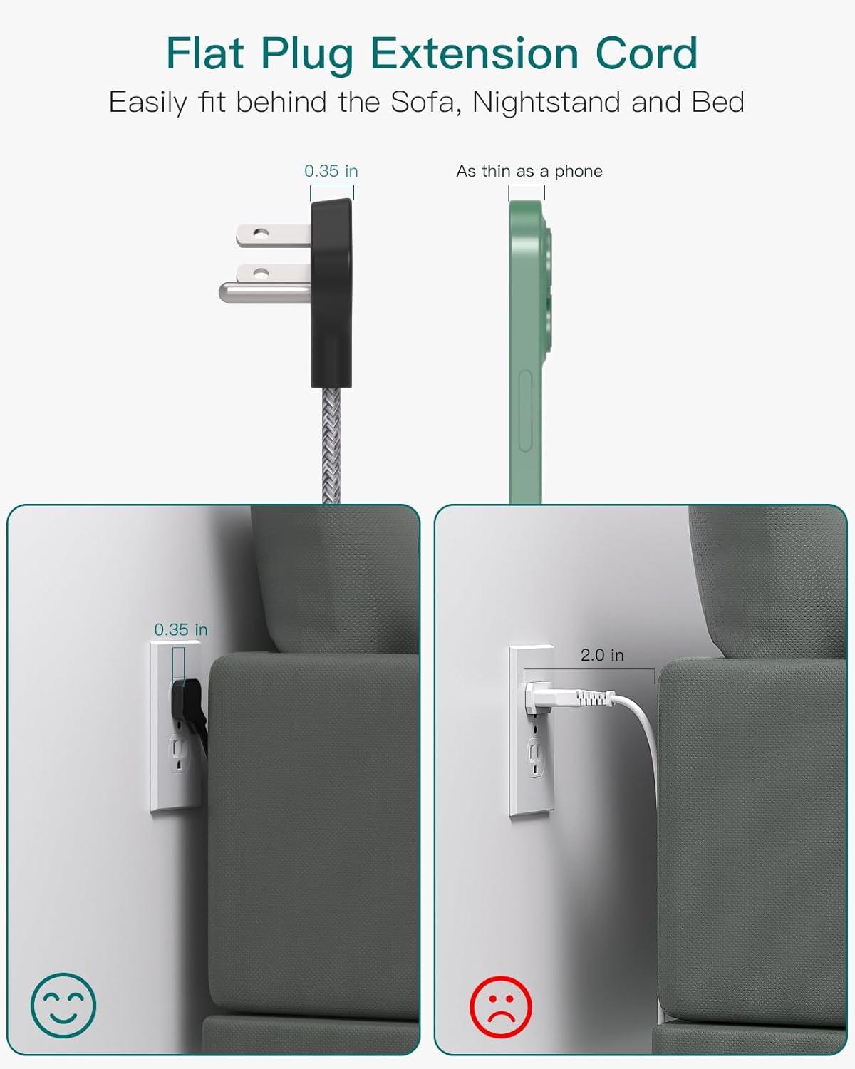【10 Ft Flat Pulg Extension Cord】- Upgraded braided extension cord 10ft is made of 100% copper wire, and the power cord is long enough to reach the corner. With only 0.35 inch ultra thin plug and 45-degree right angle design, which is much slimmer than traditional plugs, which can close to the wall easily, and hide in the back of furniture, bed or refrigerator