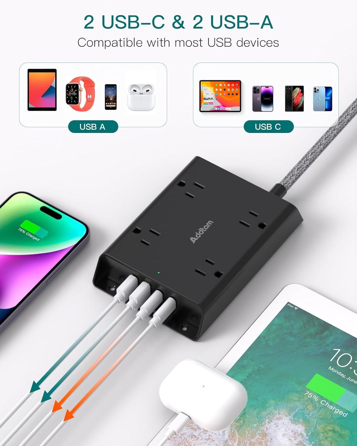 【Power Strip with USB C Ports】- Added extra 2 USB C ports for your devices, the USB C power strip can charge up to 5V/3A. USB-A ports can charge up to 5V/2.4A Max. The combination of 2 USB-C and 2 USB-A can be compatible with more usb devices, must-have accessories for college dorm room, home, office