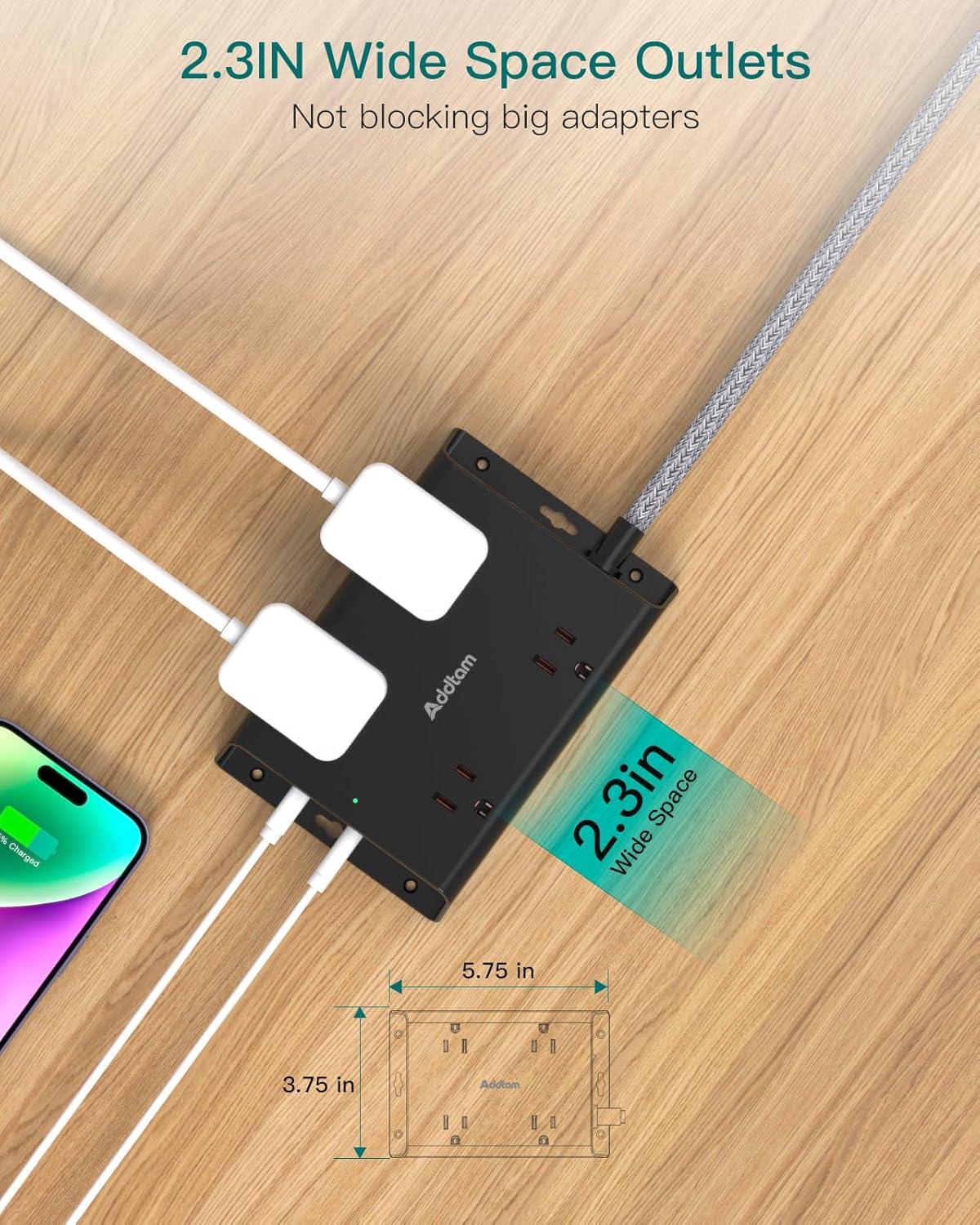 【Wall Mount Power Strip 】- No need to measure and guess where you had to attach screws, Addtam unique screw fixation design on both ends allow this white mountable power strip securely installed on the wall or under the desk (4 screws included)