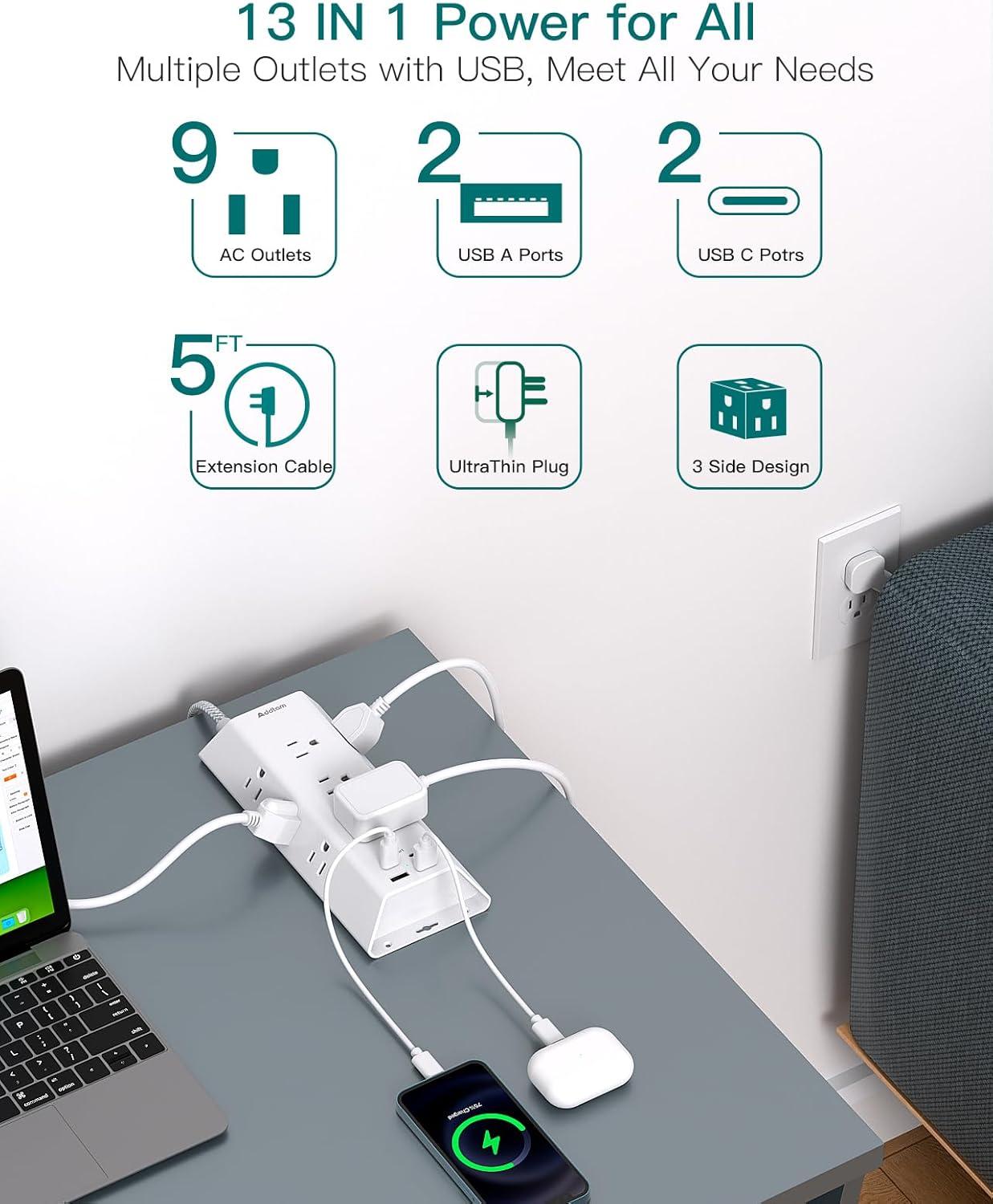【13 in 1 Power Strip】- The 3-Side design power strip with 9AC widely outlets(15A/1875W) and 4 USB charging ports can power up to 13 devices simultaneously, saving your space and make your desktop organized. Suitable for the home, office, and college dorm room essentials