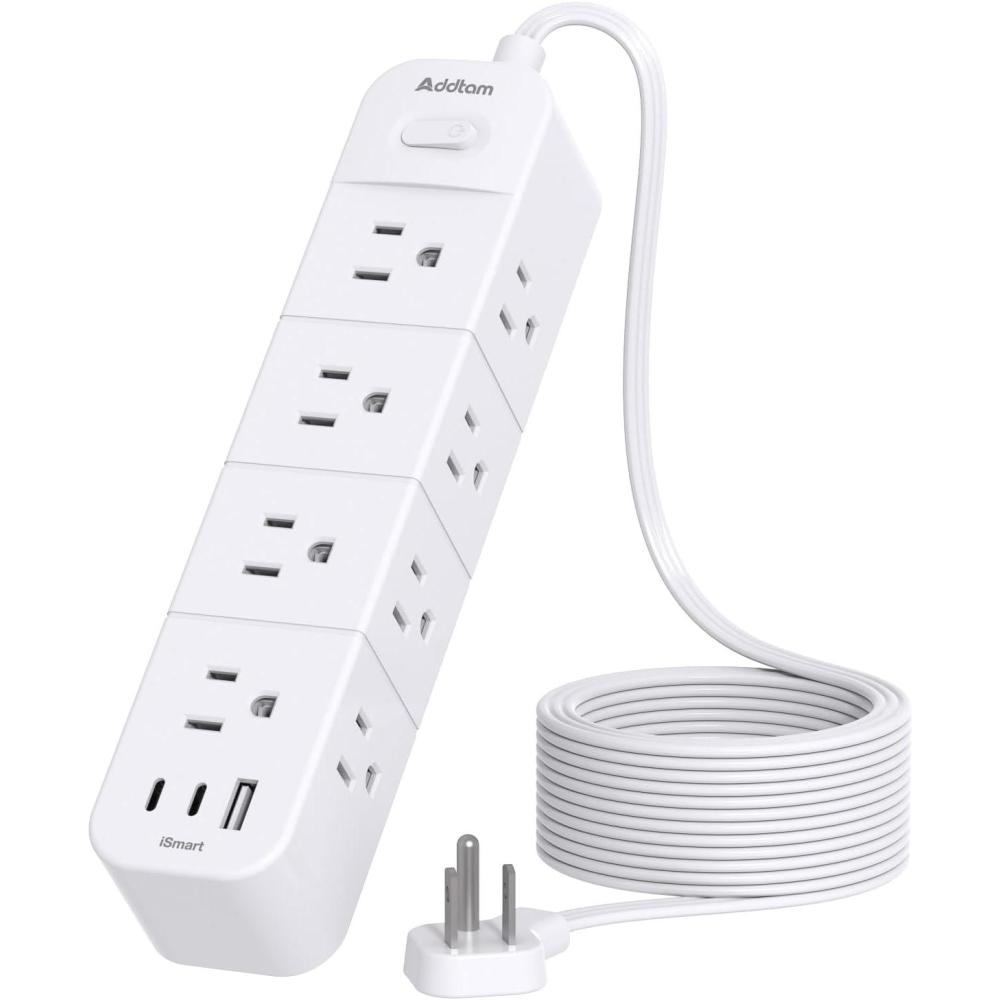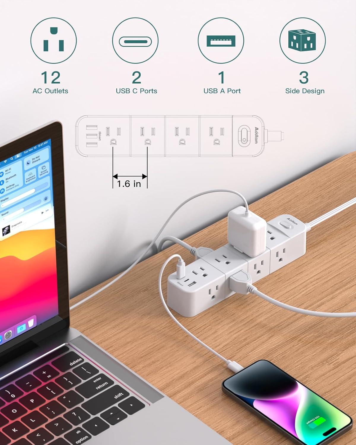 【Extension Cord with Multiple Outlets】 – This multi plug extension cord has 3 USB ports(2 USB C) and 12 AC outlets rated 15A 1875W; 3 side design outlets are separated widely enough to fit 9 big plugs; essentials for your home, office, and college dorm room