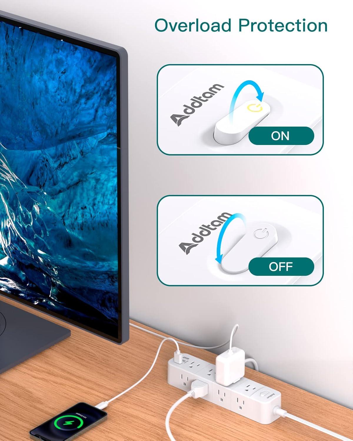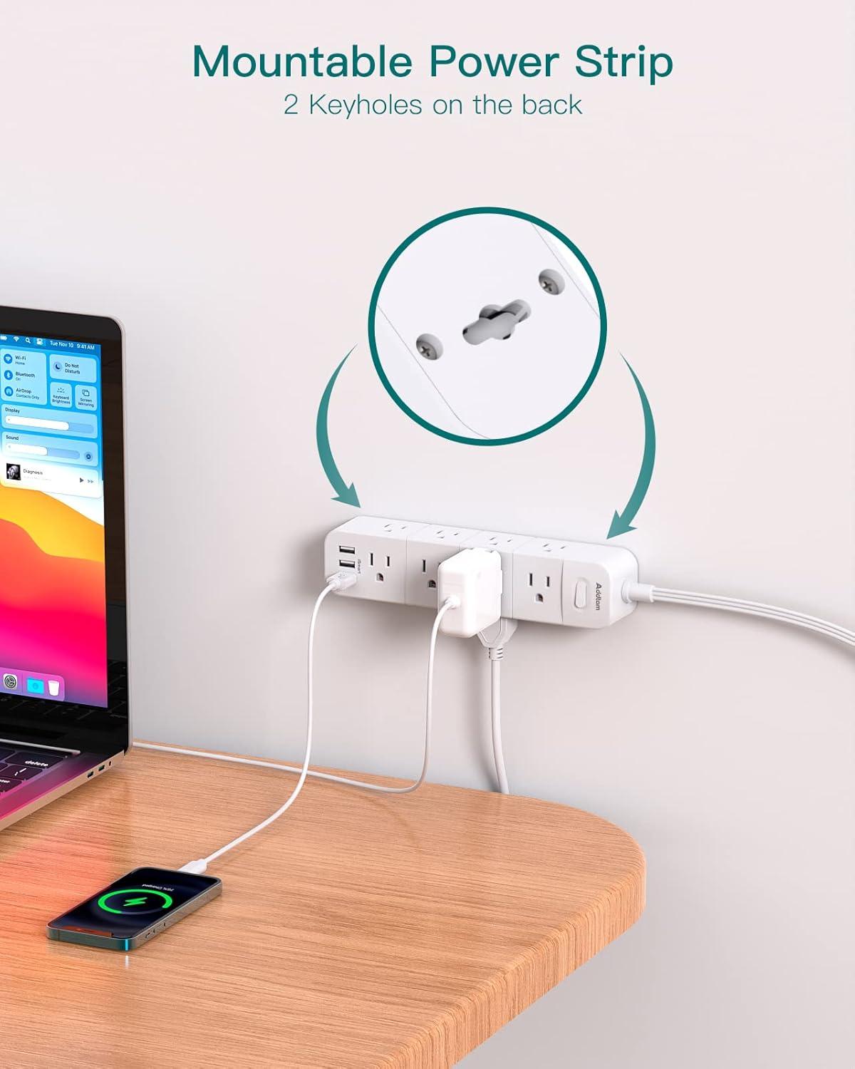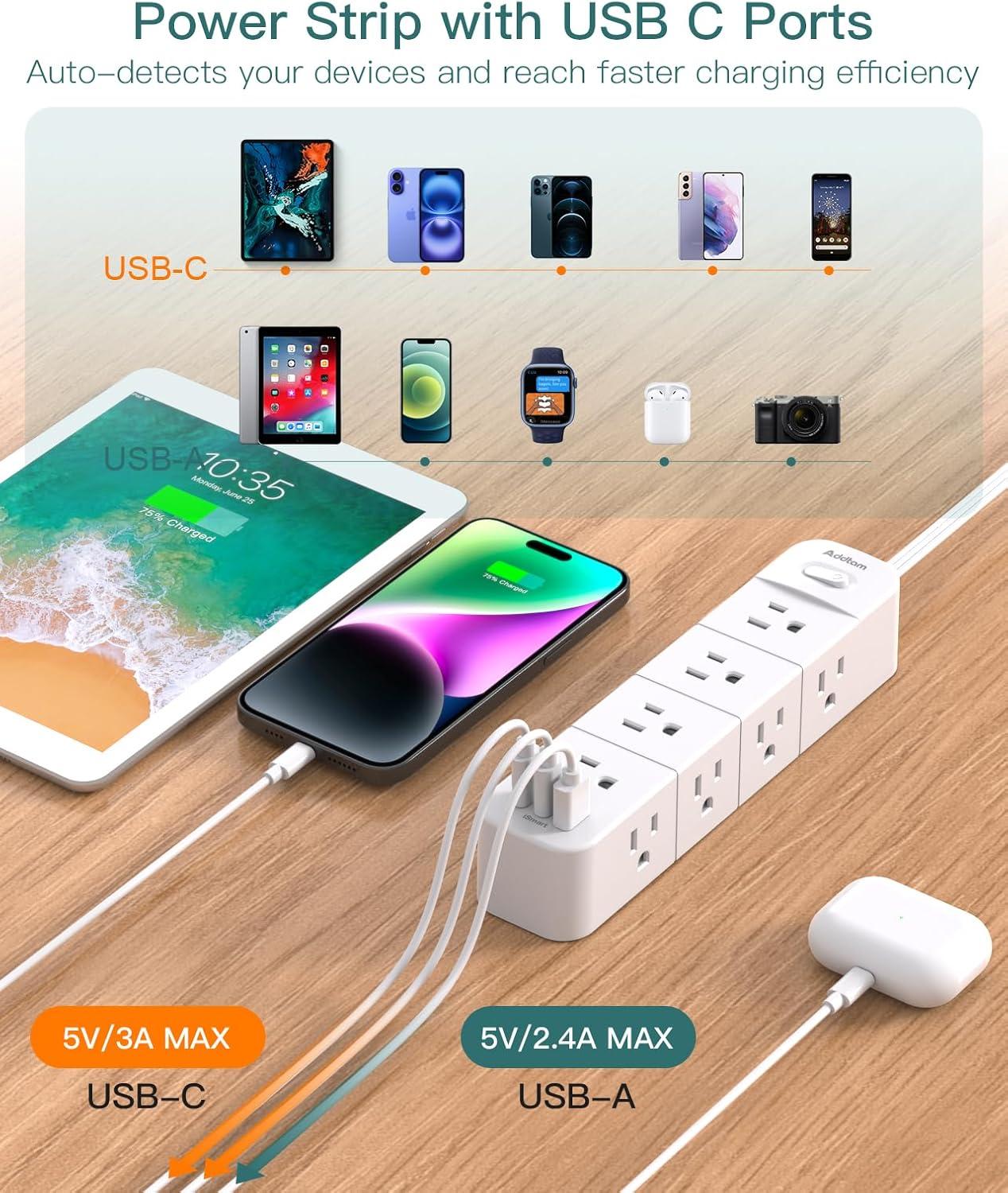 【Power Strip with USB Ports】 – This usb power strip added extra 2 USB C ports for your devices, the USB C port can charge up to 5V/3A. USB-A ports can charge up to 5V/2.4A Max, compatible with your cellphone, laptop, tablet, earphone or cameras without a variety of converters(the actual current is decided by the demand for the devices)