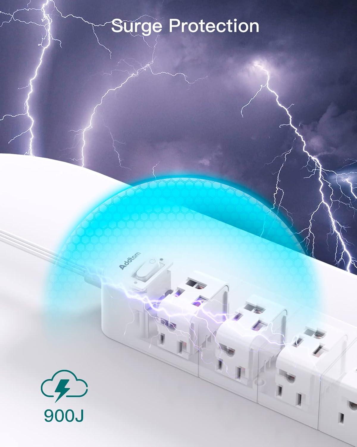 【Power Strips with Surge Protection】- 3 complementary surge protection circuits(TVS MOV GDT) with the minimum energy-absorbing capacity of 900 Joules. The overload protection switch can shut off automatically to keep your device safe. This flat power strip is also protected against over-voltage, over-current, over-charge, short-circuiting