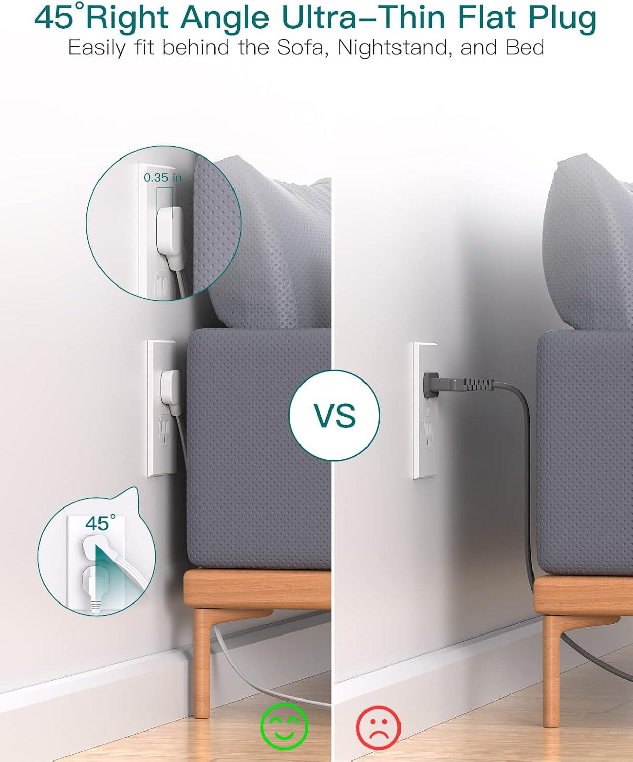 【Right Angle Ultra Flat Plug 】 – With only 0.35 inch ultra thin plug and 45-degree right angle design, which is much slimmer than traditional plugs, which can close to the wall easily, and hide in the back of furniture, bed or refrigerator, no waste for every inch space for your home