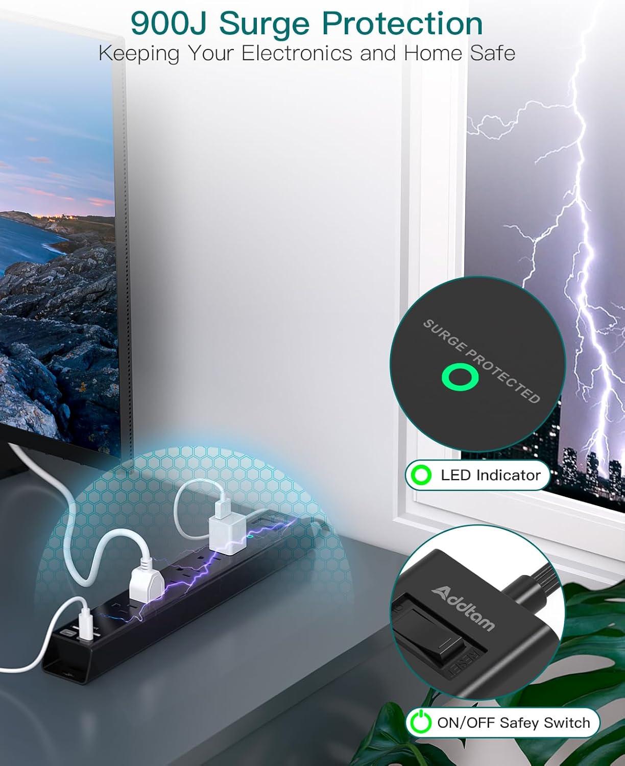 【Multi Safety Protection with ON/OFF Switch】- This power strip has surge protection (900J), overload protection, short-circuit protection, over-current protection, short-circuit protection to help keep your devices safe. The on/ off switch can automatically shut off when the power exceeds rated value, to protect your expensive devices like computers, TV etc. ETL safety certified, with extension cord and other major components certified by UL.