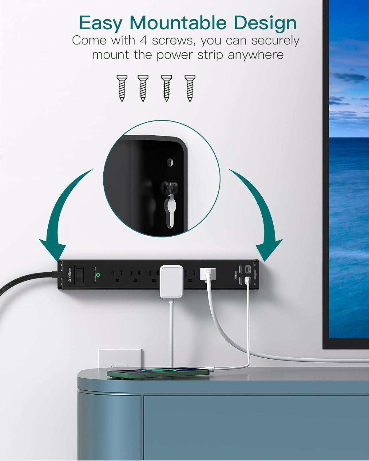 【Easy Mount on Wall and Desk 】- Mountable power strip with unique screw fixation design on both end, allow this white compact extension cord securely installed in various applications (4 screws included). It is easy for mounting to walls, desks or furniture. Keep your desktop organized. The low profile extension cord also can be stable on your desktop or nightstand without slipping off, the flat extension cord makes it lighter than ordinary power strip.