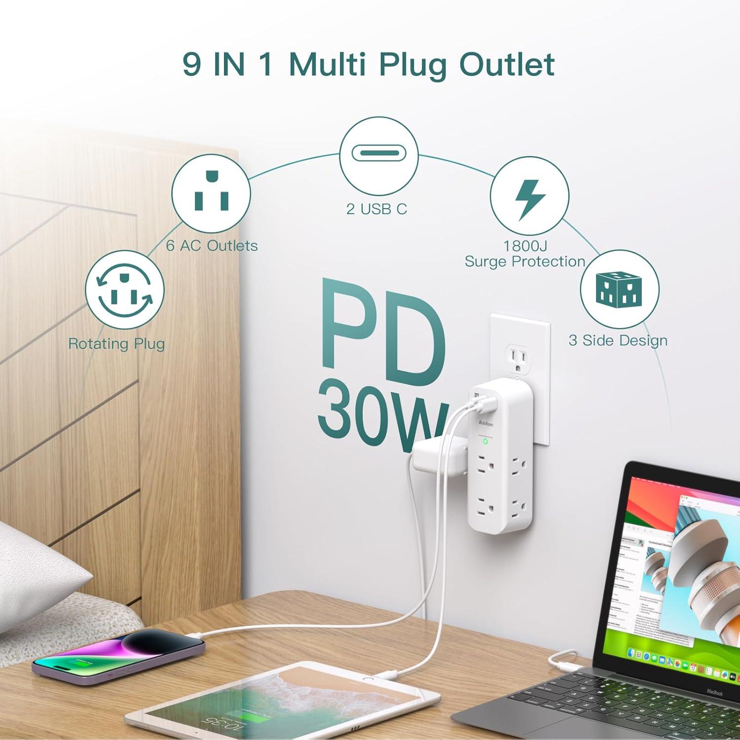 【9 IN 1 Outlet with USB Ports】- The plug adapter with 6 widely AC outlets and 3 USB charging ports (2 USB C), you can easily power up to 9 devices at the same time. The outlet splitter with 3 sided slim design, it gives you way more power options while taking up hardly any space