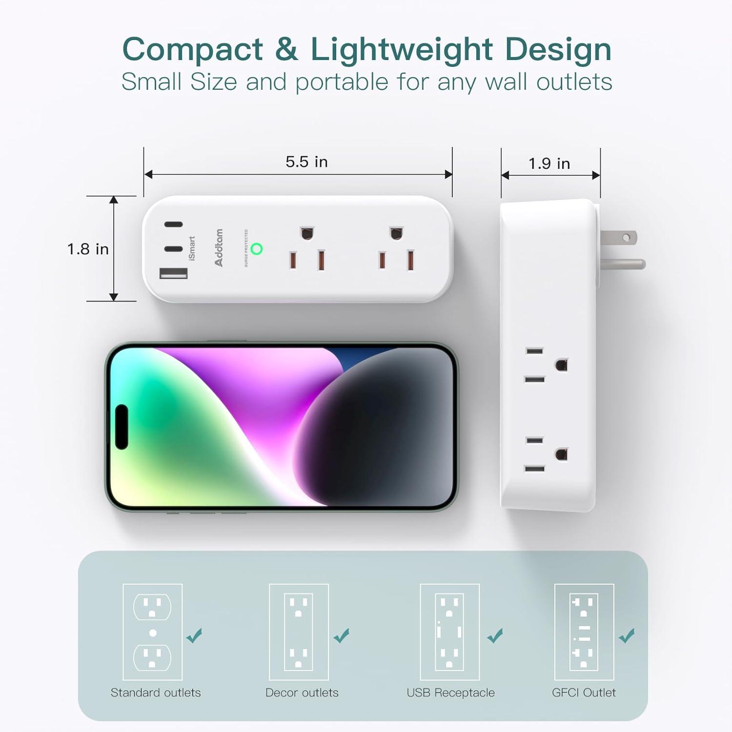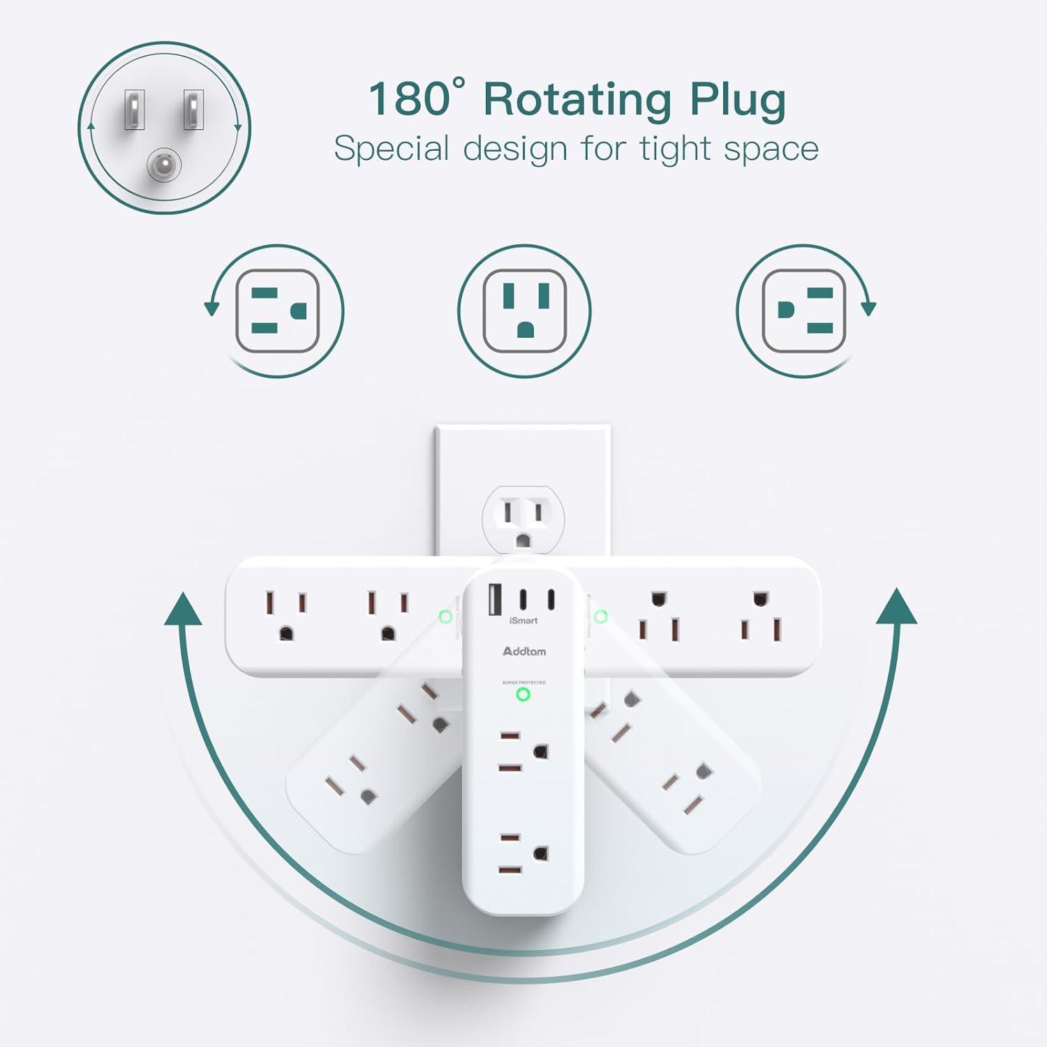 【1800J Wall Surge Protector】- The outlet extender surge protector provide 1800 joules surge protection against electrical spikes. 3 complementary Surge Protection Circuits, TVS(transient voltage suppressor) MOV(metal oxide varistor) GDT(gas discharge tube), with response speed less than 1Ns, and minimum energy-absorbing capacity of 1800 Joules, much more quickly and reliably than the traditional MOV surge protector circuit