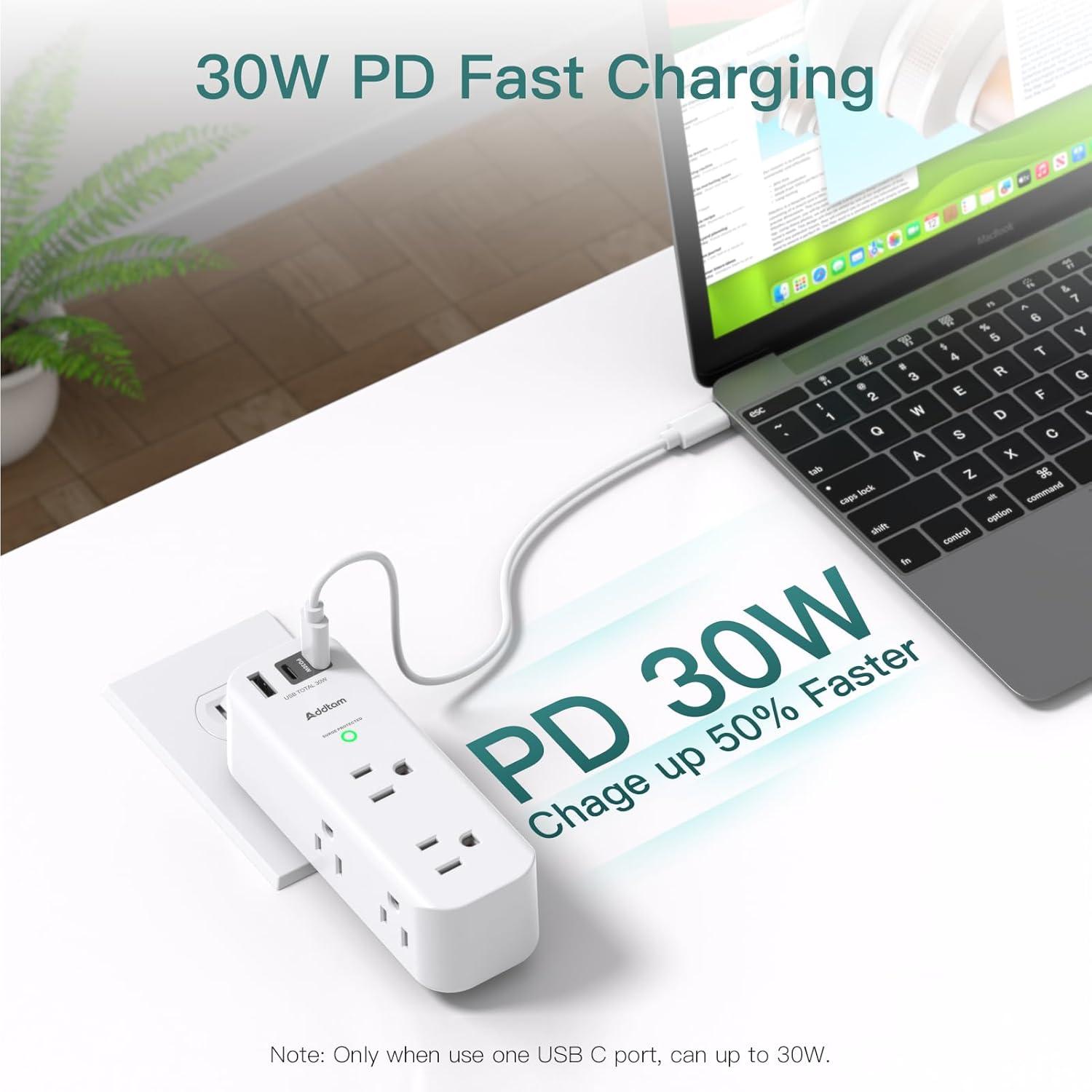【USB-C Smart Charging Ports】- The usb wall charger surge protector with 3USB charging ports (total output DC 5V/3A), USB C charging ports built in smart technolohy, can detect and charge your devices quickly, up to max 5V/3A, USB A charging port features 2.4A Max, compatible with almost all usb devices(the actual current is decided by the demand for the devices)